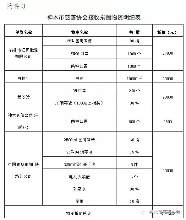 3、神木市慈善协会接收捐赠物资明细表见附件3