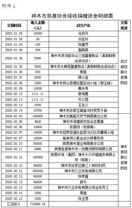 1、神木市慈善协会接收捐赠资金明细表见附件1