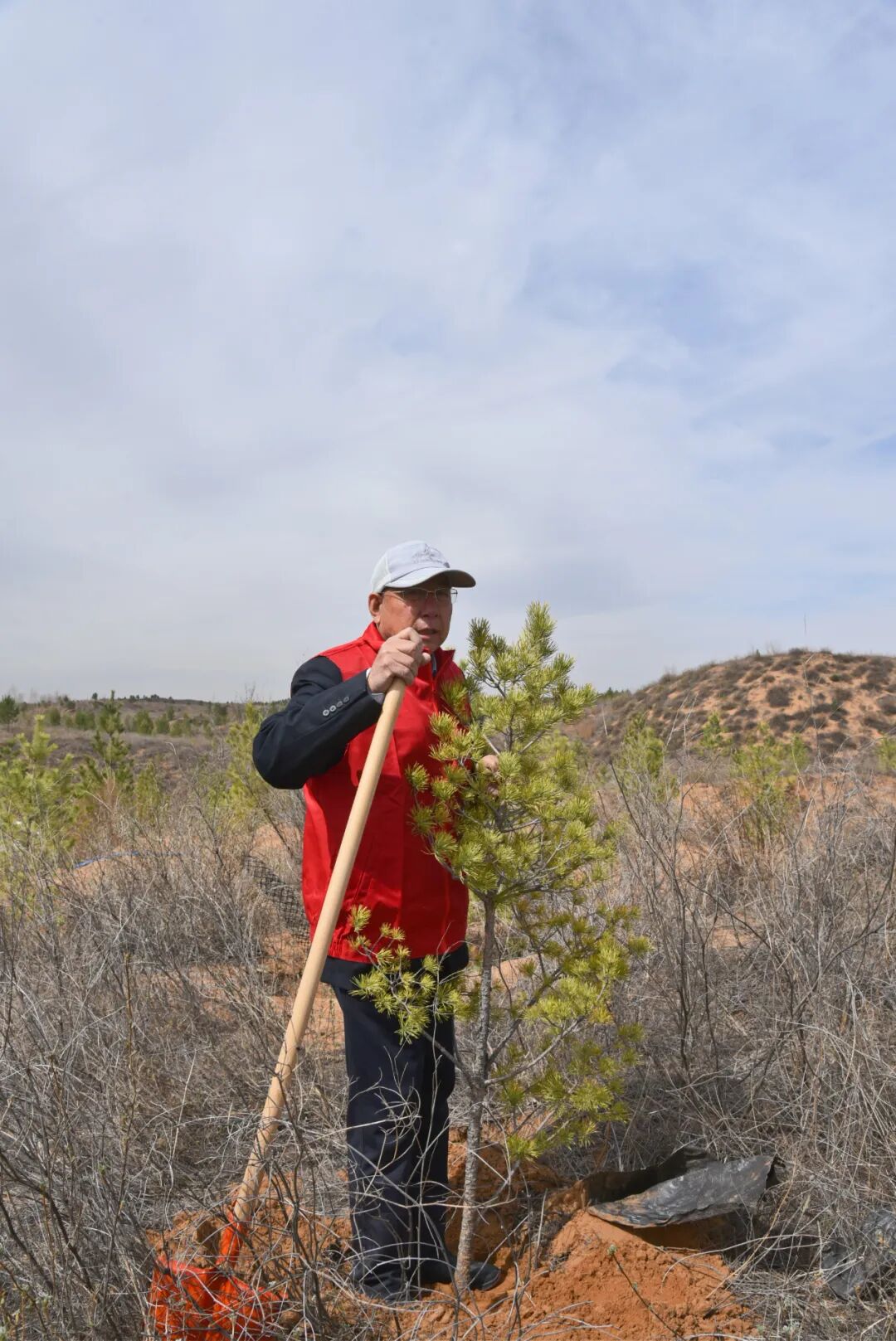 活动现场,大家分工协作,干劲十足,挥锹挖坑、扶苗培土、浇水定根一气呵成,按照植树技术规范,300余株樟子松幼苗扎根荒漠。每一抔培实的新土都凝聚着生态守护的信念,每一株挺立的树苗都寄托着绿色发展的愿景。