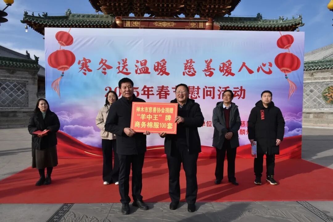 1月17日上午,神木市慈善协会联合万镇镇人民政府开展 2025年春节送温暖慰问活动,慈善协会副会长王知学、李忠智,万镇镇镇长屈虹等领导为困难户送上80套“羊中王”牌商务棉服,并诚挚祝愿大家新年快乐、健康长寿、阖家幸福。